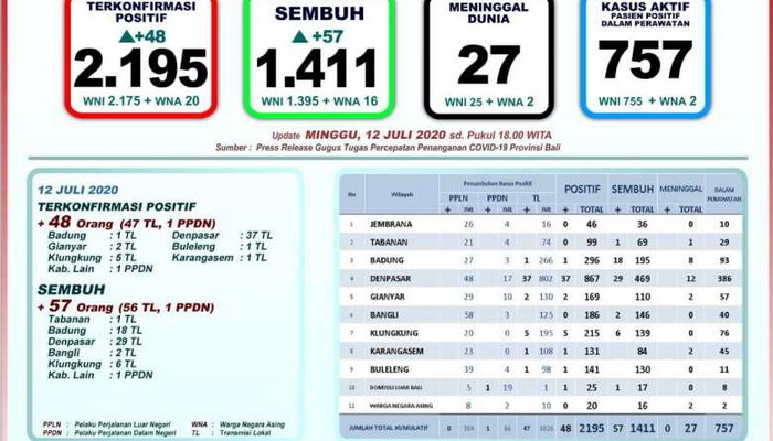 Hari ini bertambah 57 orang, terdiri dari 56 Transmisi Lokal,dan 1 PPDN,” jelas Ketua GTPP Provinsi Bali, Dewa Made Indra yang juga Sekdaprov Bali ini di Denpasar, Minggu 12 Juli 2020.
