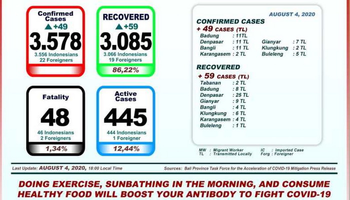 Denpasar – Ketua Gugus Tugas Percepatan Penanganan Covid-19 Provinsi Bali Dewa Made Indra menyampaikan mencatat secara kumulatif pasien positif 3.578 atau bertambah 49 orang transmisi lokal.