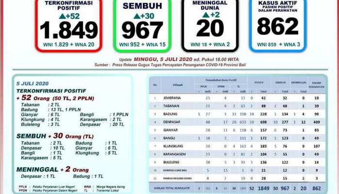 “Sedangkan jumlah akumulatif pasien positif 1849 yani bertambah 52 orang WNI, terdiri dari 2 orang PMI dan 50 orang Transmisi Lokal,” sebut Ketua GTPP Provinsi Bali, Dewa Made Indra yang juga Sekdaprov Bali ini di Denpasar, Minggu 5 Juli 2020.