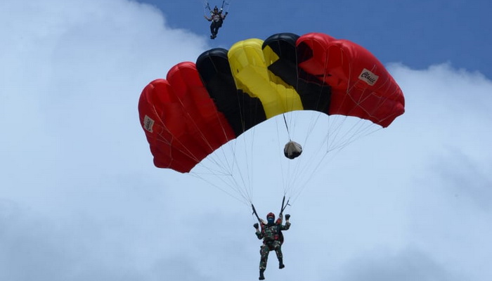 Puluhan penerjun profesional perwakilan dari TNI AD, TNI AL, TNI AU, dan Polri ini merupakan rangkaian kegiatan gladi sekaligus merupakan gema persiapan event berskala internasional “TNI Internasional Marathon Mandalika 2018”.