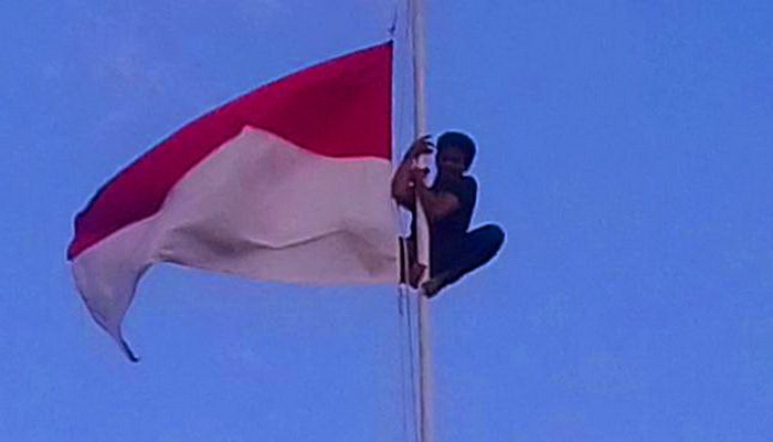 Setelah diizinkan, Kristianus dengan aksi heroiknya dan dengan sigap memanjat tiang bendera berketinggian sekitar 15 meter untuk memperbaiki tali bendera yang tersangkut.