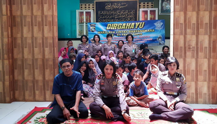 | Kasatlantas Polresta Denpasar Kompol Rachmawaty Ismail saat mengunjungi Panti Asuhan Al Ittihad Rasyid wa Habib serangkaian peringatan Hari Lahir Lalu Lintas Bhayangkara ke-63 |