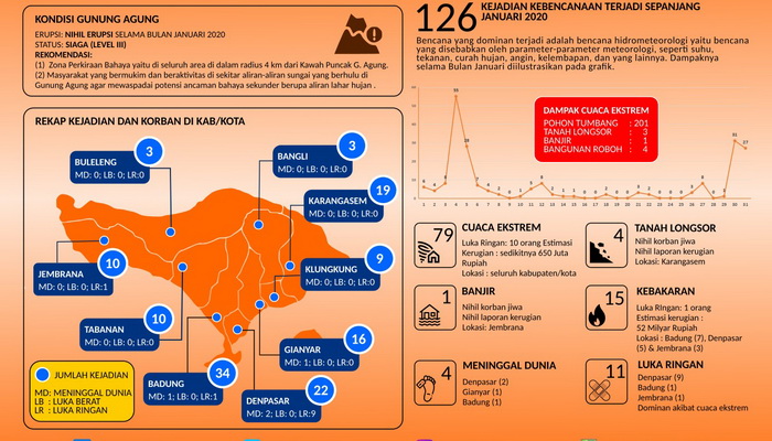 “Kami menyediakan infografis kejadian di Provinsi Bali bulan Januari 2020 sebagai upaya diseminasi informasi serta meningkatkan kesiapsiagaan masyarakat Bali khususnya menghadapi fenomena cuaca ekstrem,” ujar Rentin dalam keterangannya Minggu (9/2/2020).