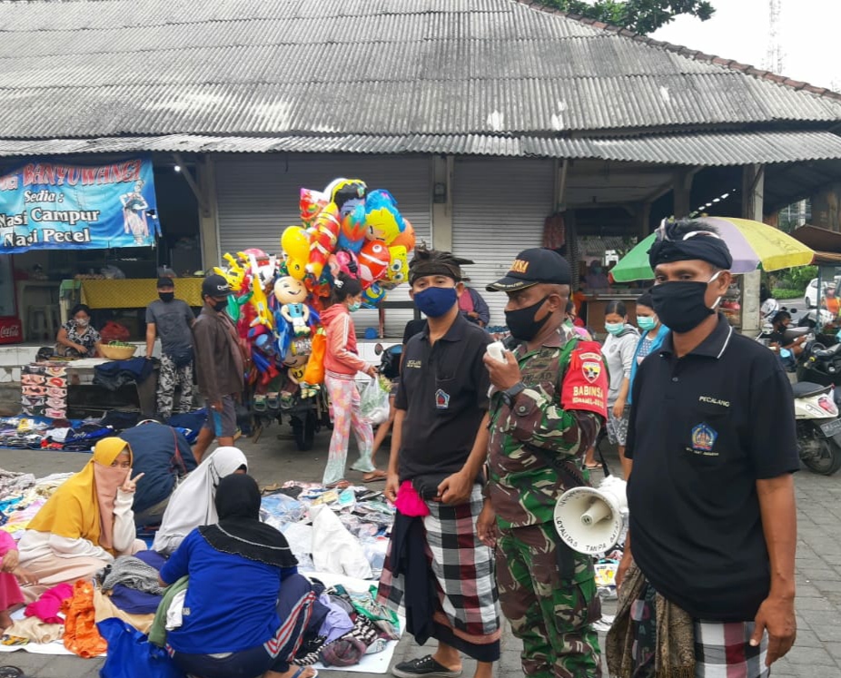 Mangupura-Bali, Bertempat di Pasar Tradisional Banjar Bhuana Gubuk, Kelurahan Jimbaran, Kecamatan Kuta Selatan, Kabupaten Badung Babinsa 1611-08/Kuta Selatan, Kelurahan Jimbaran Serma Johanis melaksanakan sosialisasi bersama Pecalang Desa Adat Jimbaran tentang pendisiplinan penerapan protokol kesehatan dalam rangka menyongsong New Normal, Minggu (05/07/2020) kemarin.