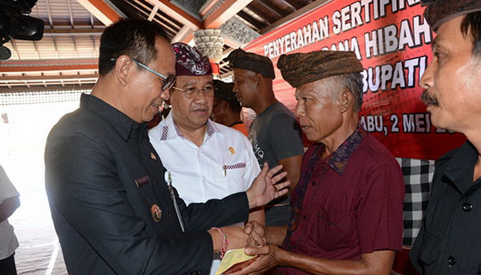 | Wakil Bupati Badung Ketut Suiasa saat penyerahan sertifikat warga di Mengwo dam Pura Patitengat |