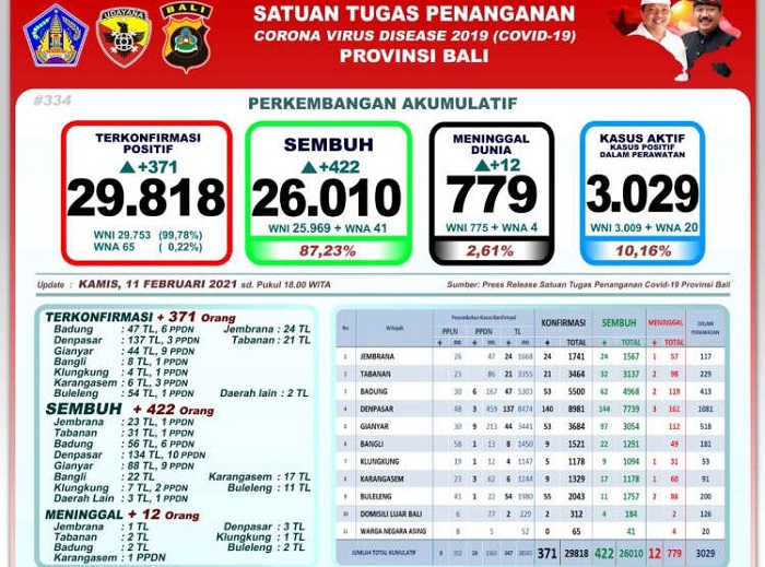 Data Satgas Penanganan Covid-19 Provinsi Bali, sebaran wilayahnya, angka