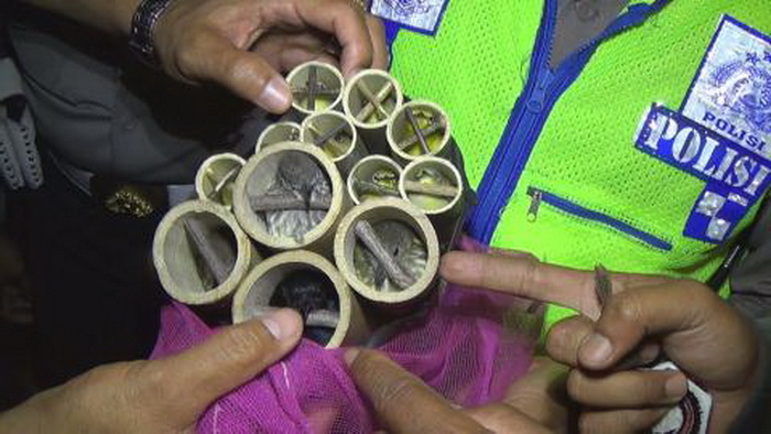 Belasan burung langka yang dilindungi diduga diselundupkan Najib (39), asal Lumajang, Jawa Timur dengan cara memasukan burung-burung tersebut ke dalam bilah bambu.