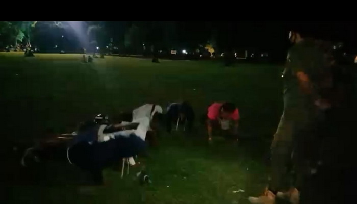 | Lima orang anak muda dihukum push up karena melanggar karena menciptakan kerumunan di Lapangan Puputan Badung I Gusti Ngurah Made Agung Sabtu (1/8/2020)/ist. |