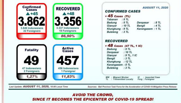 Gugus Tugas Percepatan Penanganan COVID-19 Provinsi Bali menyampaikan perkembangan Penanganan Corona Virus Disease (COVID-19) di Provinsi Bali per Selasa (11/8/2020).
