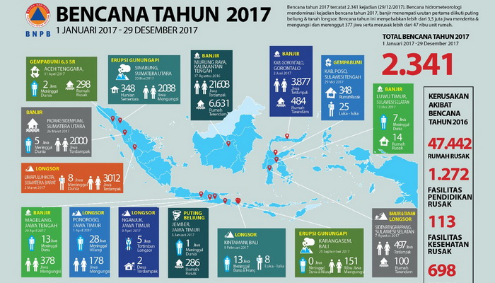 JAKARTA – Berdasar catatan Badan Penanggulangan Bencana Nasional (BNPB) sepanjang kurun Tahun 2017 tercatat 2.341 kejadian bencana yang merenggut korban jiwa 377 orang di seluruh Tanah Air.