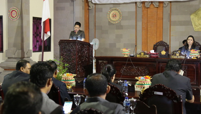 TABANAN – Bupati Tabanan Ni Putu Eka Wiryastuti menyampaikan Laporan Keterangan Pertanggungjawaban (LKPJ) pada Sidang Paripurna yang berlangsung di Aula DPRD Tabanan, Bali, Jumat (7/4/17).