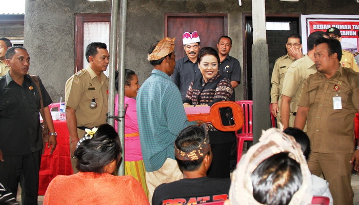 TABANAN – Bupati Tabanan Ni Putu Eka Wiryastuti menyerahkan bantuan program bedah rumah kepada salah satu KK Miskin atas nama Nyoman Mastra ( 40 ) asal Desa Bantas dan penyerahan Bantuan Pilot Project Program Partsisipatif Dara manis Kelar Raskin kepada Sembilan kelompok di Br Bantas Kaja, Desa Bantas, Selemadeg Timur.