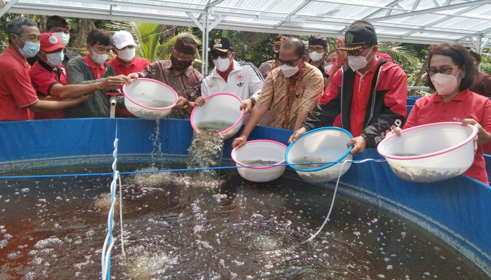 Sebagai tanda dimulainya usaha budidaya ikan lele sistem bioflok tersebut, Bupati Tabanan I Komang Gede Sanjaya bersama Anggota Komisi IV DPR RI I Made Urip dan Kepala BPIUUK Karangasem didampingi Kepala Dinas Perikanan Kabupaten Tabanan AA. Ngurah Raka Iswara, Camat Penebel dan Kepala Desa Riang Gede melakukan penebaran benih lele di lokasi kolam bioflok Pokdakan Mina Dharma Pertiwi, Desa Riang Gede, Kecamatan Penebel, Minggu (18/9/2021).