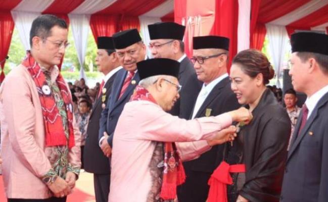 | Wakil Presiden Republik Indonesia K.H. Ma’ruf Amin menyematkan pin Satya Lencana Kebaktian Sosial kepada Bupati Tabanan Ni Putu Eka Wiryastuti |