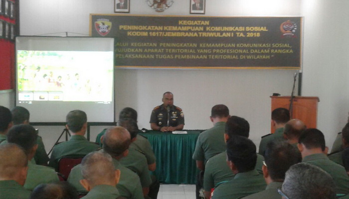 Hal itu disampaikan Dandim 1617/Jembrana Letkol Kav. Djefri Marsono Hanok saat melaksanakan kegiatan peningkatan kemampuan Komunikasi Sosial (Komsos) bagi personelnya bertempat di Aula Makodim setempat Jalan Ngurah Rai No. 135 Kelurahan Dauhwaru Kecamatan Jembrana.