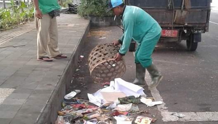 | Petugas DLHK Kota Denpasar saat membersihkan sampah di pinggir jalan |
