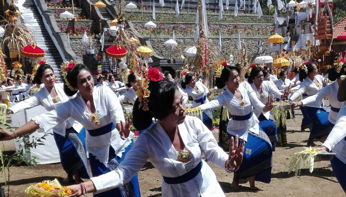 | Tarian salah satu rangkaian upacara Puncak Karya Ngenteg Linggih di Pura Penataran Karangasem |
