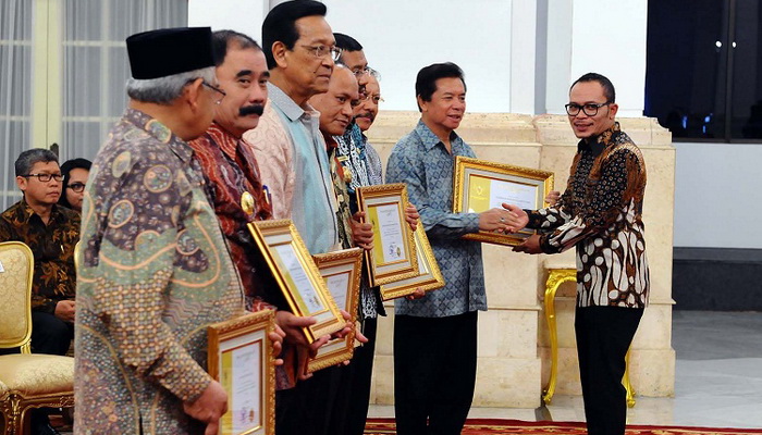 | Menaker Hanif menyerahkan piagam penghargaan Paramakarya 2015 kepada Gubernur DIY, Gubernur Aceh dan sejumlah bupati wali kota mewakili wilayahnya, di Istana Negara, Jakarta (foto:Setpres) |