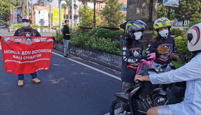 Denpasar – Komunitas Honda ADV Indonesia Bali Chapter (HAI) bersama dengan dealer Honda Asia Motor menggelar aksi sosial membagikan masker kepada pengendara motor roda dua di jalan raya.