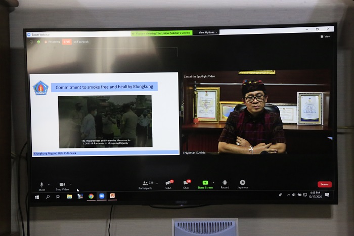Bupati Suwirta menyampaikan pandangannya melalui Video Conference bertempat di ruang Kerja Kantor Bupati Klungkung Kamis (17/12/2020)/ist. |