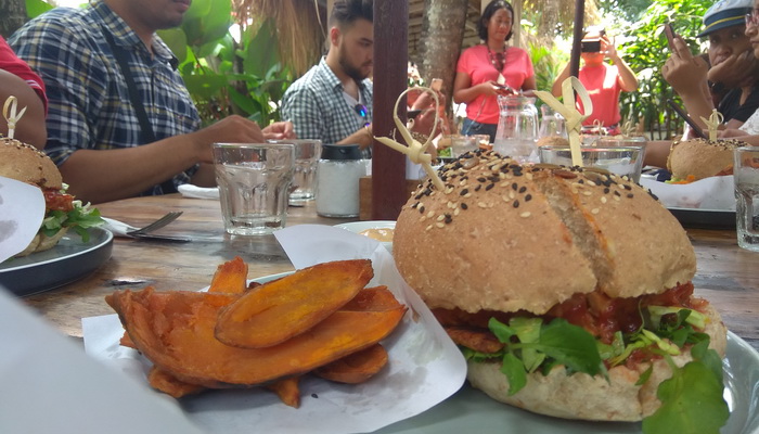 | Salah satu menu disajikan restoran di Canggu yang disukai wisatawan asing berupa Burger Tempe dikombinasi kulit ubi cilembu |