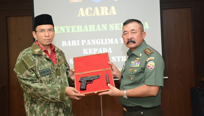 | Gubernur NTB Tuan Guru Bajang (TGB) Muhammad Zainul Majdi menerima senpi dari Panglima TNI Jenderal Gatot Nurmantyo lewat Pangdam Udayana Mayjen Komaruddin Simanjuntak |