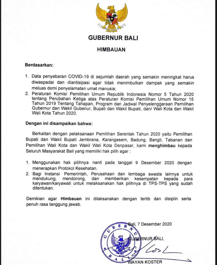 Denpasar – Gubernur Bali Wayan Koster melalui surat imbauan tertanggal