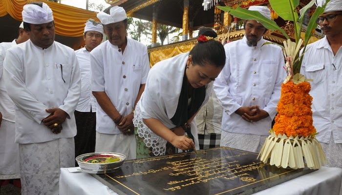 Kebetulan belum lama ini, tepatnya pada 3 April lalu, krama desa pekraman setempat menggelar puncak upacara ngenteg linggih pada Pura Desa lan Puseh setempat. Dalam kehadirannya kemarin, Bupati Eka melakukan penandatanganan prasasti.