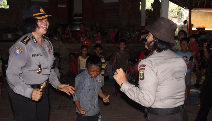 “Kami datang untuk menghibur anak-anak agar mereka merasa gembira, riang, senang, bahagia dan tidak bosan, ketika berada di pengungsian. Semoga anak-anak ini tidak trauma atas situasi ini,” ucap mantan Kasetum Polda Bali ini.