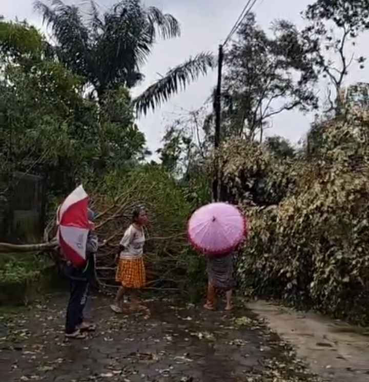 Beberapa akses jalan sempat tertutup akibat pohon berdiameter besar yang roboh, namun sebagian sudah terkondisi.