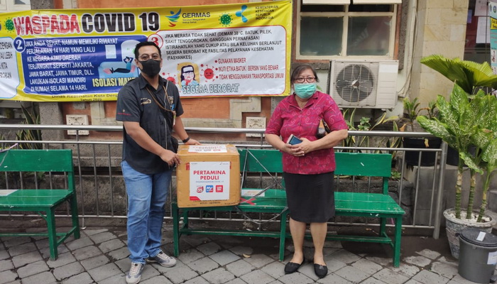Di masing-masing sarfas distribusi, para pimpinan operasi turun langsung menyerahkan bantuan dukungan bagi para masyarakat. Manager FT Pertamina Sanggaran, Muhammad Andika Gunawan menyerahkan bantuan APD bagi Nakes kepada Kepala Unit Pelaksana Teknis Dinas (UPTD) Puskesmas Pedungan IV, drg. Made Saraswati.