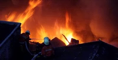 Dalam tempo singkat, amukan api melahap komplek pertokoan berlantai dua karena tiupan angin malam yang cukup kencang.