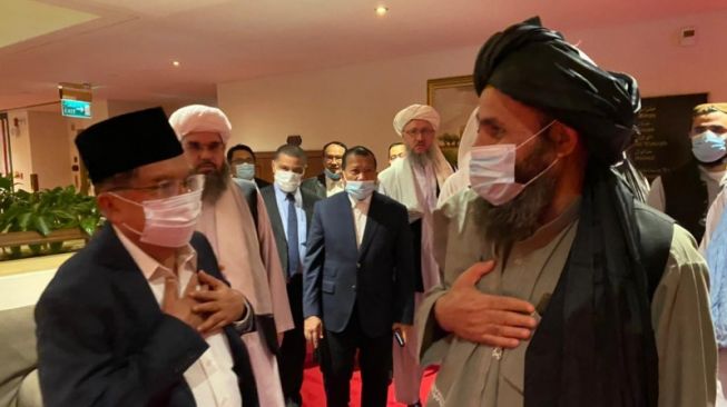 Wakil Presiden ke-10 dan ke-12 RI Jusuf Kalla bertemu dengan perwakilan kelompok Taliban. [Dok. Tim Media JK] |