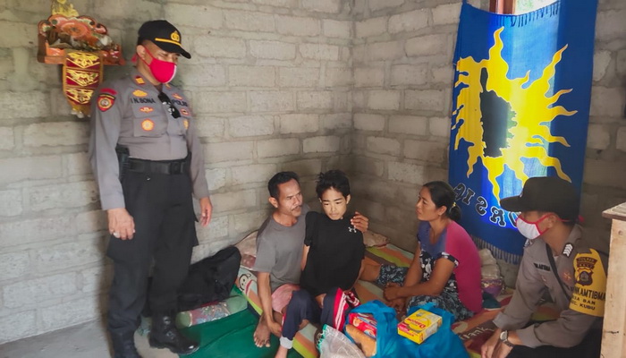 Amlapura – Polres Karangasem – Polsek Kubu, Kapolsek Kubu Polres Karangasem AKP. I Nengah Sona, SH di dampingi Kanit Intelkam Ipda I Wayan Sutanaya dan Bhabinkamtibmas Desa Ban Bripka I Nengah Budiartana melaksanakan giat mengunjungi warga disabilitas / lumpuh I Kadek Roi Pastika, laki laki, 16 tahun di rumahnya lingkungan Dukuh Tangeban, lingkungan Cutcut Desa Ban Kubu Karangasem, Selasa (09/06/2020) pkl.10.00 Wita.