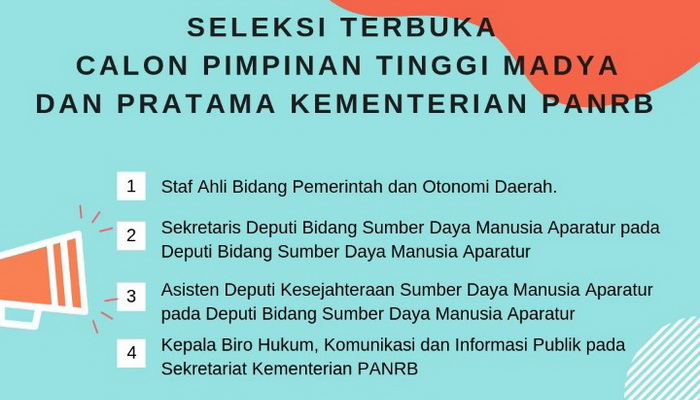 Jakarta – Peluang Aparatur Sipil Negara (ASN) yang memenuhi syarat untuk mengikuti seleksi terbuka Calon Pimpinan Tinggi Madya dan Pratama di lingkungan Kementerian PANRB terbuka lebar.