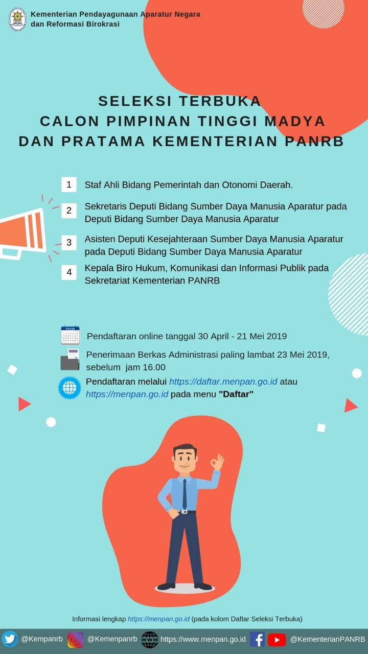 Berdasarkan Pengumuman Nomor: B/65/S.KP.12.00/2019 tentang Seleksi Terbuka Calon Pimpinan Tinggi Madya dan Pratama di lingkungan Kementerian PANRB Tahun 2019 yang ditandatangani Sekretaris Kementerian PANRB Dwi Wahyu Atmaji, pendaftaran online ditutup tanggal 21 Mei 2019 melalui situs https://daftar.menpan.go.id.