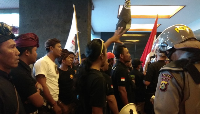 Massa tergabung Koalisi Rakyat Bali (KRB) diantaranya dari Perguruan Sandi Murti, Garda Nasionalis Patriot Indonesia, langsung menggeruduk Hotel Aston Denpasar, tempat ustaz Abdul Somad (UAS) menginap, Jumat (8/12/2017).
