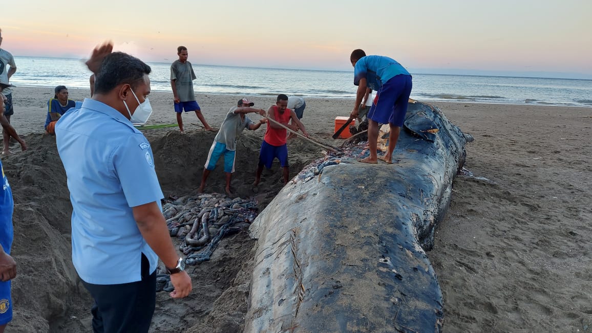 koordinasi dengan kepala dusun setempat, bangkai paus diputuskan dikuburkan,