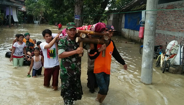 DEMAK – Kodim 0716/Demak menerjunkan pasukan ke lokasi banjir termasuk untuk mengevakuasi paksa warga yang sakit namun terjebak banjir di wilayah Sayung.