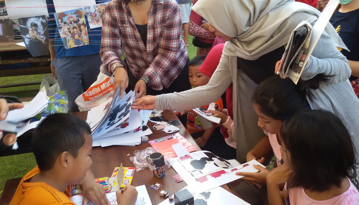 Para anak-anak usia sekolah pun tak ketinggalan untuk mampir unjuk kebolehan untuk mewarnai dan mencoba membentuk paper craft / Selain anak-anak, orang dewasa mencoba untuk membentuk papercraft.