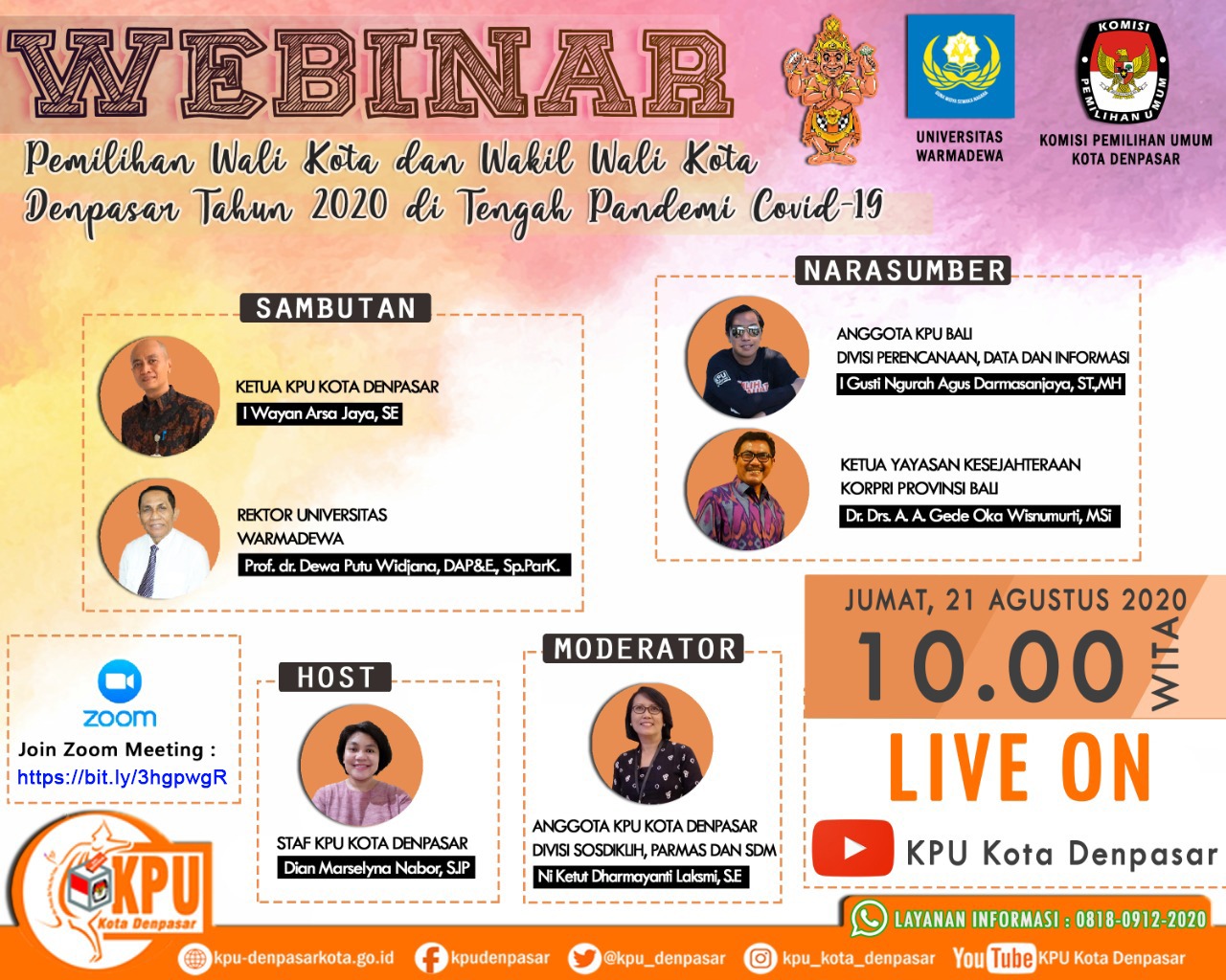 “Sehingga dapat dilaksanakan semua tahapan Pilkada dan berakhir dengan sukses,” kata Arsa Jaya, saat memberi sambutan pembukaan Webinar Pemilihan Walikota dan Wakil Walikota Denpasar Tahun 2020 di Tengah Pandemi Covid-19, Jumat (21/8/2020).