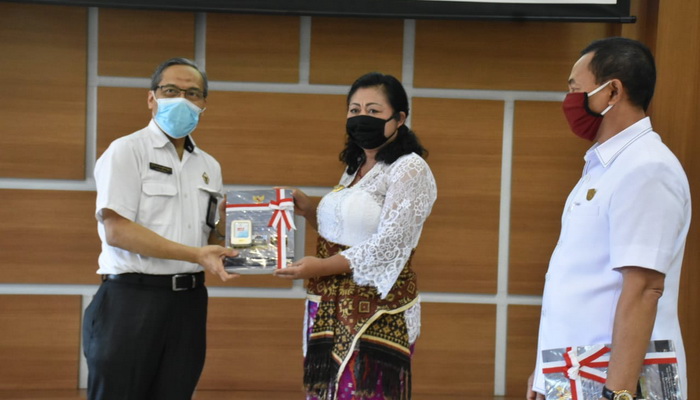Kepala Perwakilan BPK Provinsi Bali Dr. Sri Haryoso Suliyanto menyerahkan hasil audit kepada Bupati Karangasem I Gusti Ayu Mas Sumatri.