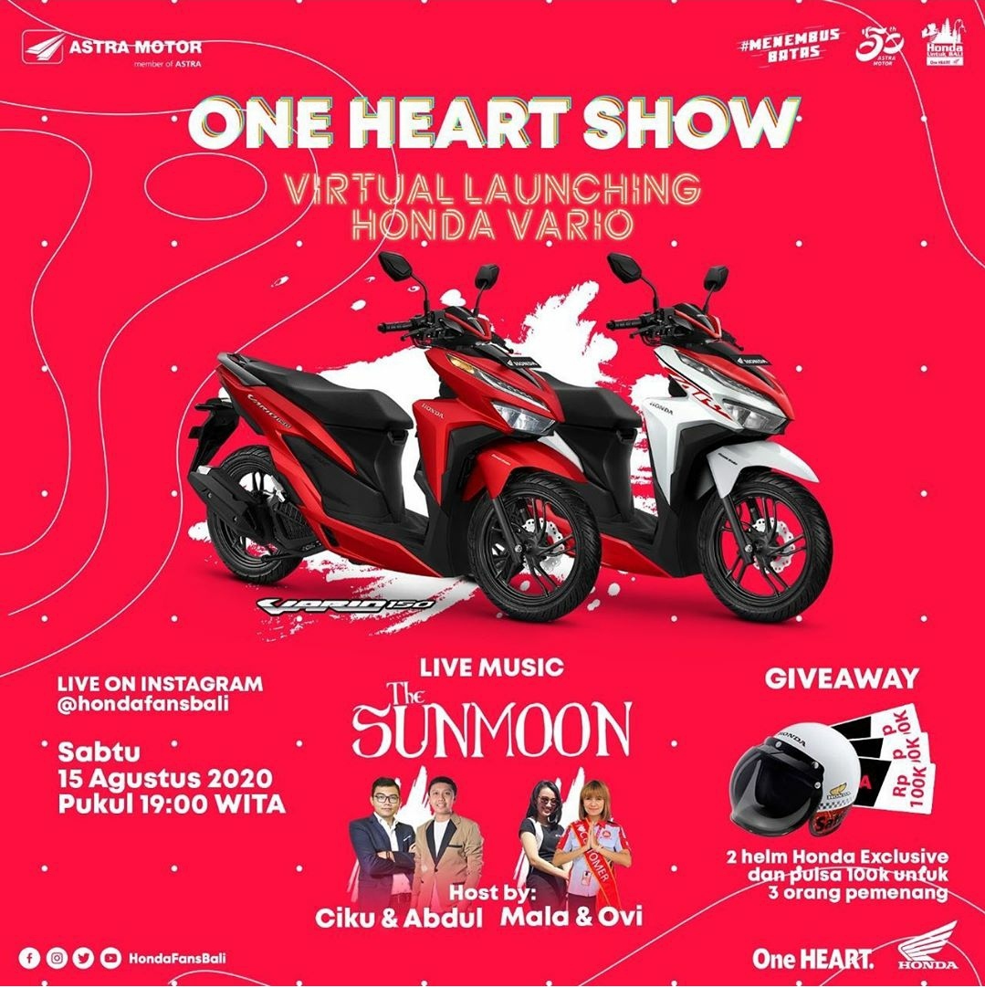 Acara special “One Heart Show” Exclusive Launching Virtual Honda Vario ini akan dilaksanakan pada 15 Agustus 2020 pada pukul 19.00 wita di Instagram @hondafansbali yang akan dipandu oleh frontline people pilihan Honda dan akan dimeriahkan oleh penampilan special dari The Sunmoon.