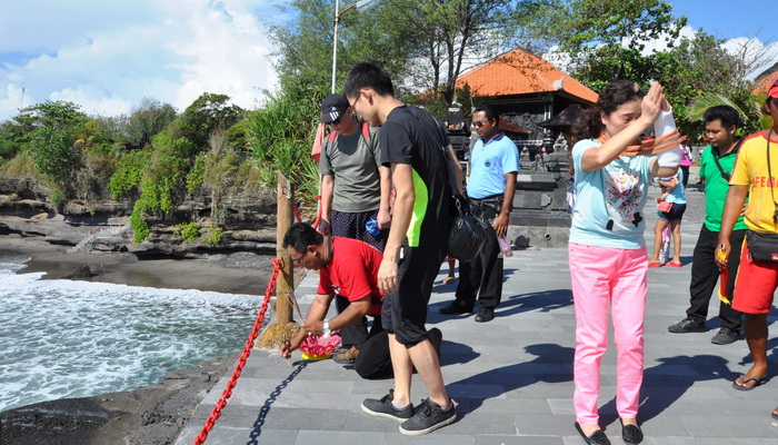 Fang dan rombongan berdoa di lokasi kejadian Pura Batu Bolong Tanah Lot. |