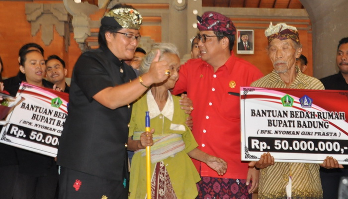| Bupati Badung I Nyoman Giri Prasta didamping Wabup Tabanan I Komang Gede Sanjaya secara simbolis menyerahkan BKK Bedah rumah 300 unit |