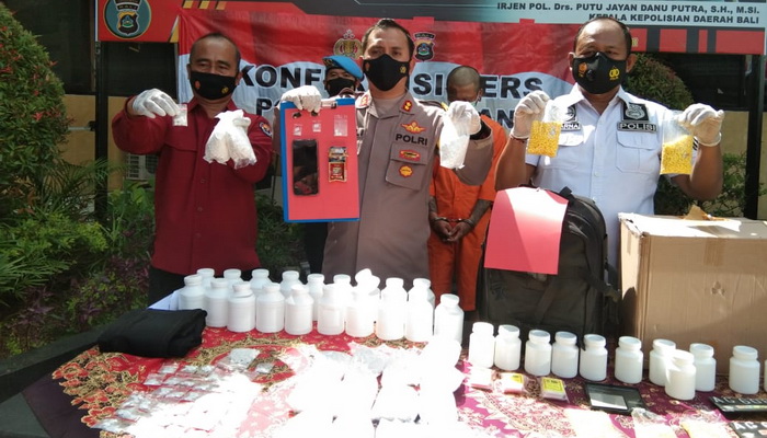 “Tersangka dijerat pasal 112 ayat 1 UU Nomor 35 tahun 2009 tentang Narkotika, ancaman hukuman penjara paling singkat 4 tahun paling lama 12 tahun dan denda paling sedikit 800 juta dan paling banyak 8 milyar rupiah dan Pasal 196, 197 UU Nomor 36 tahun 2009 tentang Kesehatan ancaman hukuman pidana penjara paling lama 15 tahun dan denda paling banyak Rp 1,5 milyar,” papar Kapolres Tabanan AKBP Ranefli Dian Candra saat menggelar jumpa pers di Mapolres Tabanan, Senin (23/8/2021)