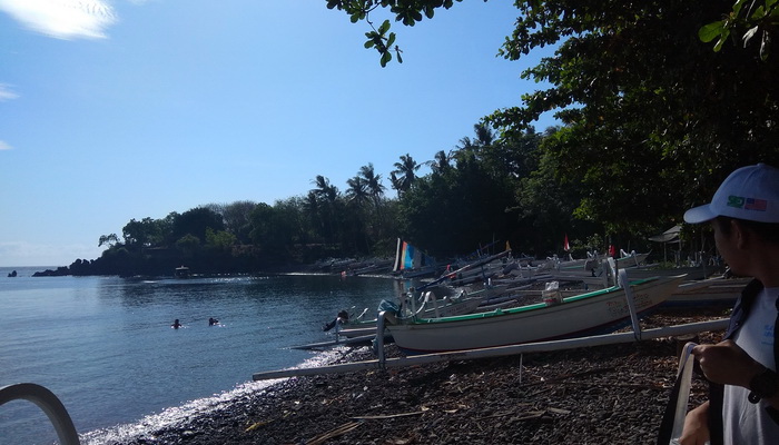 Saat menyusuri pesisir pantai Tulamben, tidak seperti pantai-pantai di Bali yang mengandalkan pasir putih, wisatawan justru menemukan, batu-batu hitam atau kerikil yang membatasi darat dan lautan.