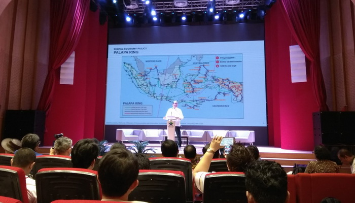 | Menkominfo Rudiantara memberi sambutan dalam pembukaan Rakernas AMSI di Gedung Perpustakaan Nasional |
