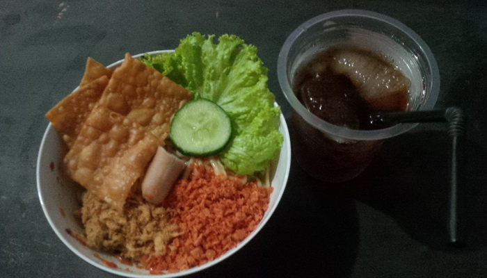 Mie setan pedas moncrot karyanya itu terdiri dari mie, pangsit, sosis, timun, selada, abon dan bumbu balado.