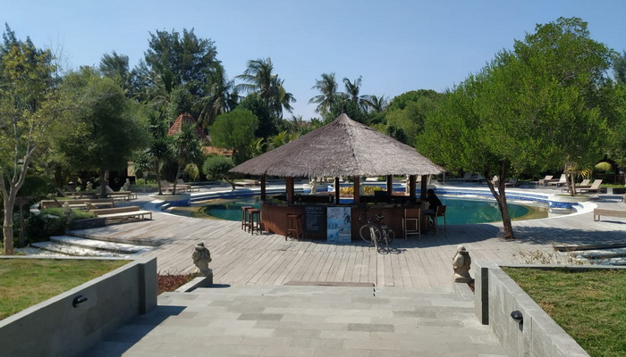 | Kolam renang Ergon Pandawa Resort yang langsung menghadap Pantai Gili Trawangan, Lombok. NTB |